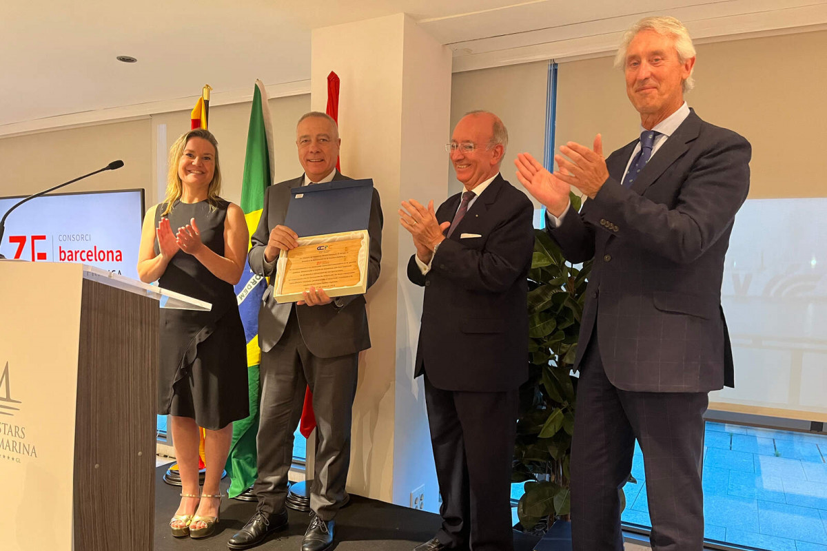 El delegado especial del Estado en el CZFB, Pere Navarro, acompañado de la directora general del CZFB, Blanca Sorigué, fue el encargado de recibir dicho premio que reconoce la trayectoria de este ecosistema empresarial ubicado en la Zona Franca de Barcelona, que fomenta la creación de sinergias entre todos los agentes económicos, tanto empresariales como profesionales, que se reúnen en el disruptivo edificio con el objetivo de desarrollar proyectos de innovación y nuevas tecnologías basadas en la industria 4.0. En el acto institucional contó con la participación de Trinidad Jiménez, nueva presidenta de la Cámara de Comercio Brasil-España y Clemente de Lima Baena Soares, Cónsul General de Brasil en Barcelona.