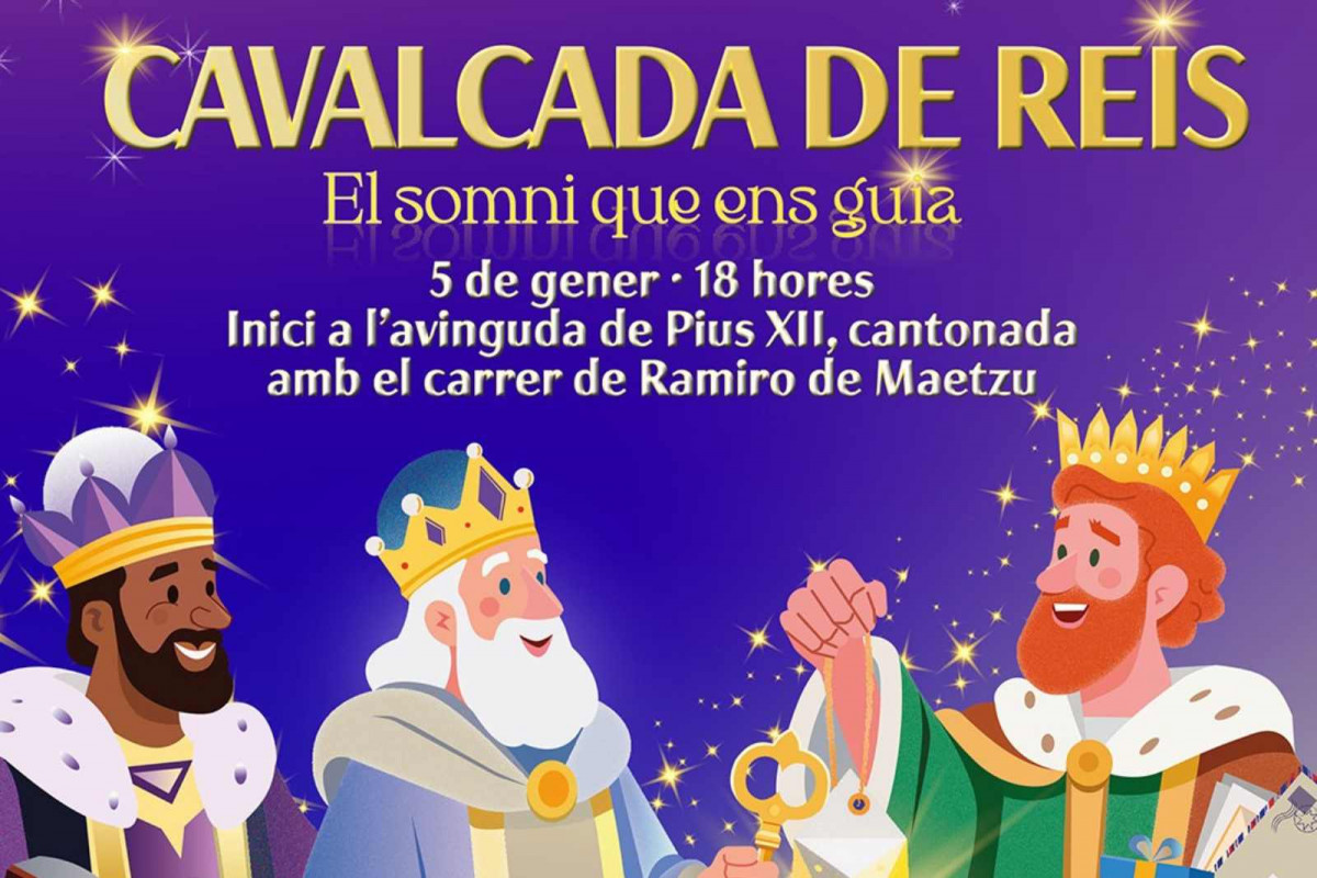 La Cavalcada de Reyes, bajo el lema “El sueño que nos guía”, comenzará a las 18:00 en la Avenida de Pius XII y finalizará a las 20:45 en la Calle de Sant Bru con la Riera de Canyadó.