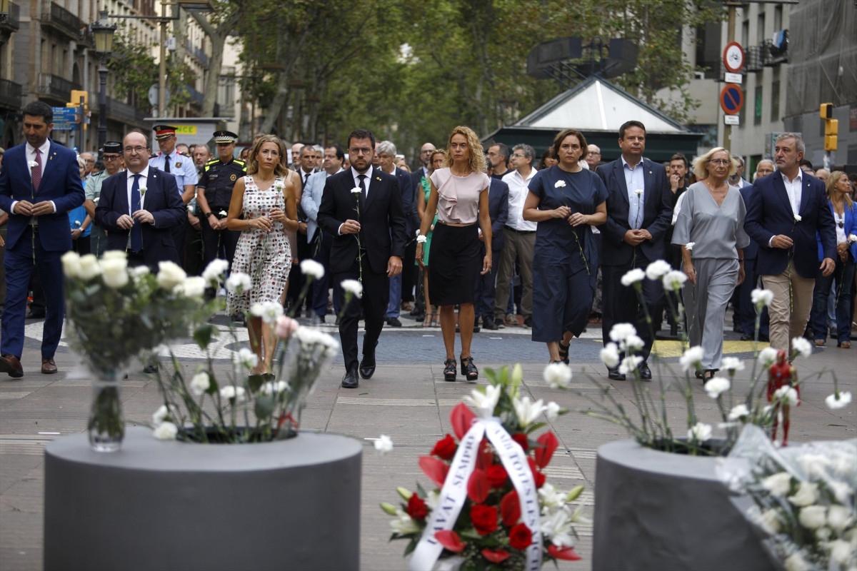 El Pla de l'Os de La Rambla, a la altura de la calle Hospital, ha sido, un año más, el escenario del acto de homenaje a las víctimas del atentado islamista de hace 5 años en este paseo de Barcelona. El president de la Generalitat, Pere Aragonès, la alcaldesa de Barcelona, Ada Colau, la presidenta del Congreso, Meritxell Batet, el ministro de Cultura y Deporte, Miquel Iceta, y la ministra de Transportes, Movilidad y Agenda Urbana, Raquel Sánchez, han sido las autoridades presentes en el acto, y han guardado un minuto de silencio junto a asociaciones de víctimas y vecinos.