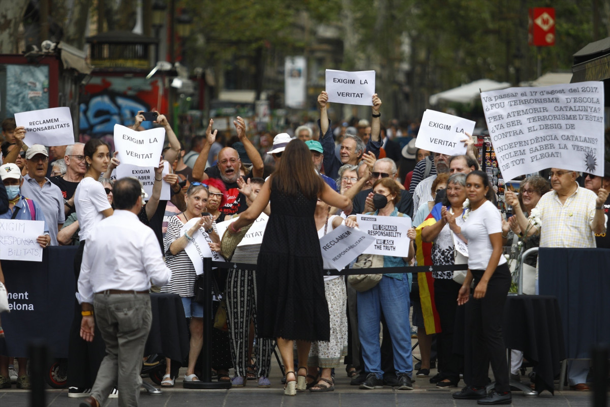 Durante el acto, unas 40 personas se han concentrado en las inmediaciones de La Rambla con carteles de 'Reclamamos responsabilidades' y 'Queremos saber la verdad', y han abucheado a las autoridades en distintos momentos de la ceremonia.