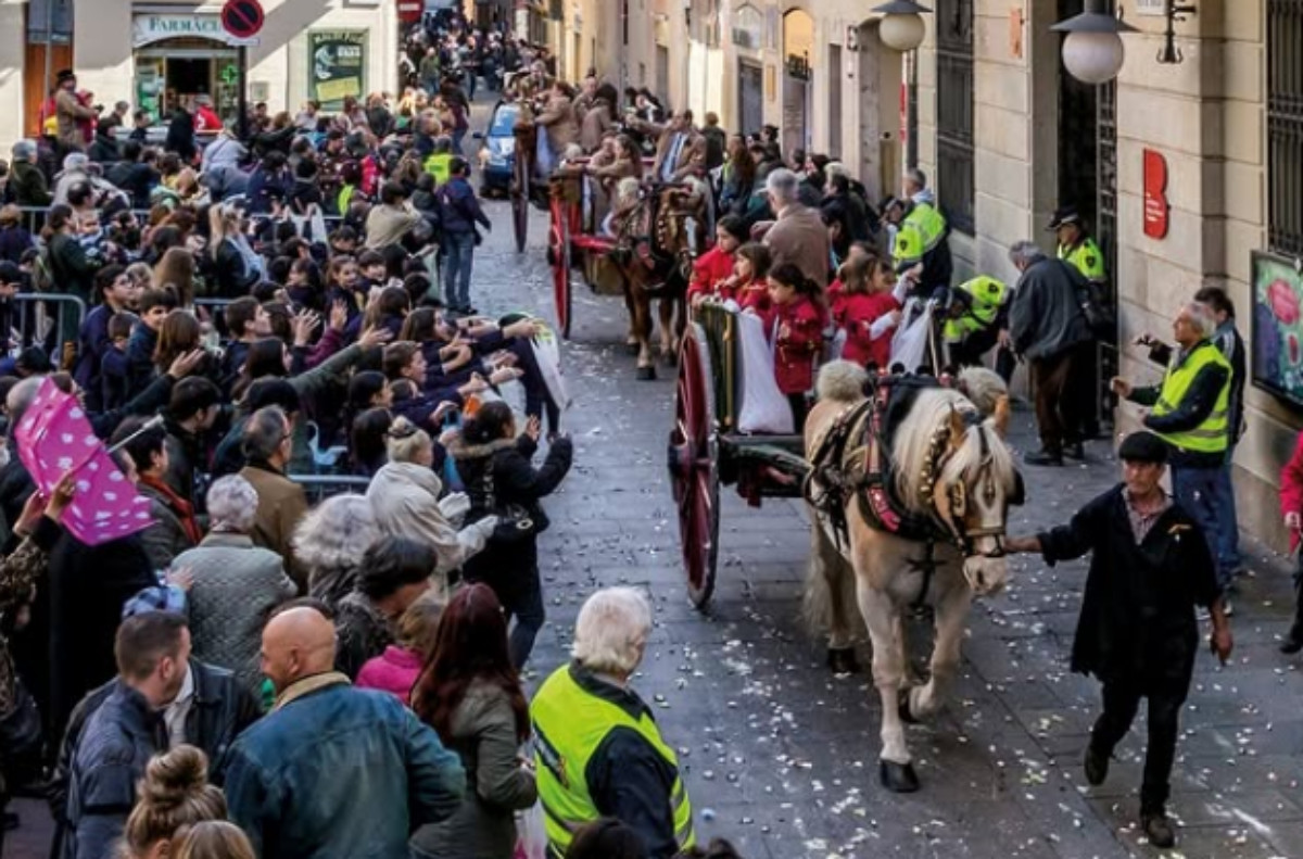 A caballo, en carruajes o camiones, los miembros de las colles lanzaron una lluvia de caramelos y golosinas para compartirlos con el público, al ritmo de la música de las bandas.