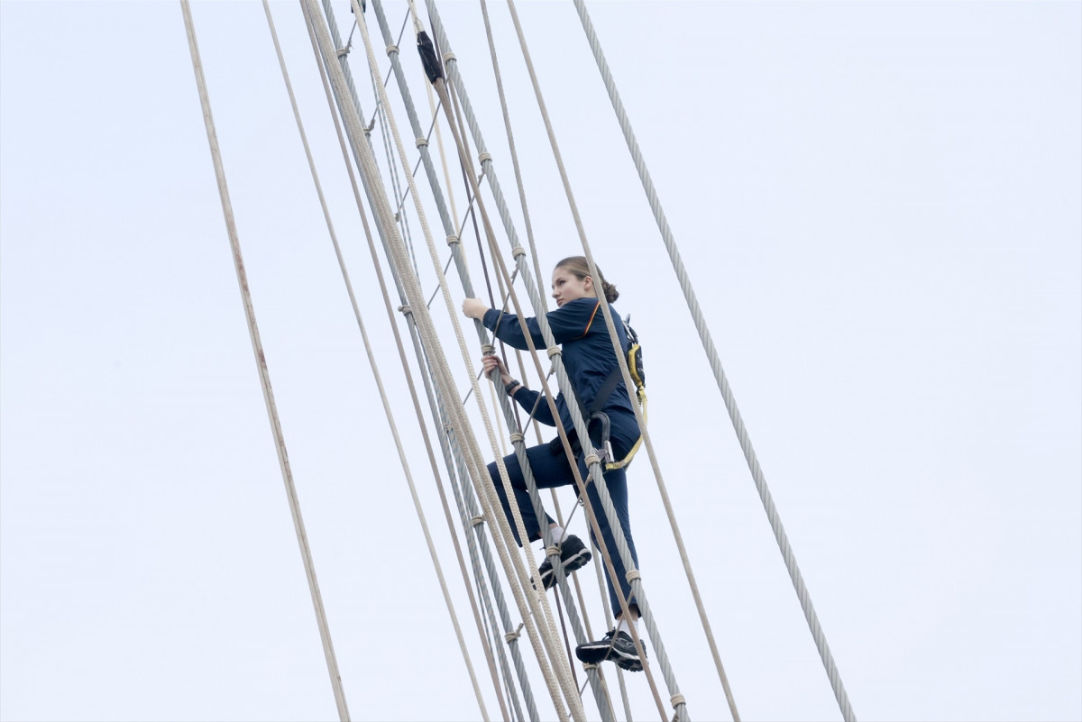 En ellas se puede ver a la Princesa Leonor con un chándal azul marino de la Armada y calzado deportivo ascendiendo por las cuerdas de escalada de uno de los mástiles del velero, provista también de un arnés de seguridad.