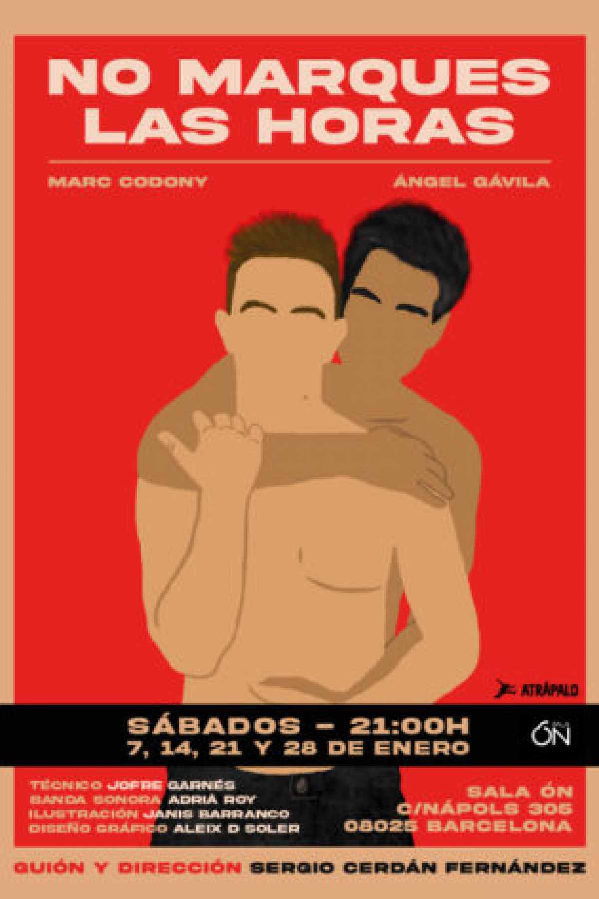 La oferta teatral barcelonesa y el número de salas en funcionamiento pone de relieve la vitalidad de la actividad escénica en nuestra ciudad al punto de no dejar de sorprendernos. Una circunstancia fortuita nos ha llevado a un pequeño teatro en pleno funcionamiento, pero del que no habíamos tenido conocimiento: la Sala On, situada en la calle de Nápoles 305, en donde, se ofrece un abanico de funciones de diversa temática y autoría. Pude descubrirla porque me había convocado a ella Sergio Cerdán, autor y director de la comedia dramática “No marques las horas” que, después de haber permanecido más de un mes en cartel y vista su aceptación, ha visto prorrogada su permanencia durante el mes de febrero.