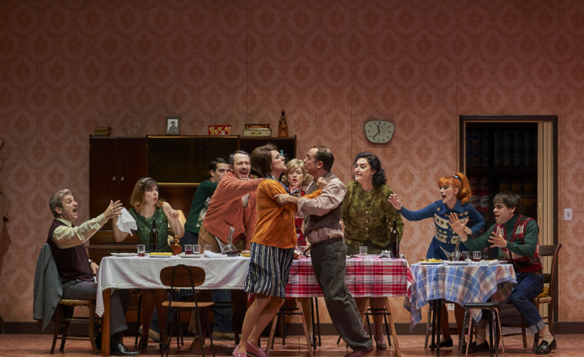 Marc Salicrú ha diseñado para ello una escenografía espectacular solo posible cuando se dispone de los medios de un teatro público, utilizando elementos desplazables capaces de convertir en un plis plas la tienda de alimentación de la familia Grimau en el interior de la vivienda, aunque nos preguntamos cómo será posible trasladar esta compleja construcción en los dieciséis bolos que se anuncian a continuación. La interpretación de Albert Ausellè, Jan D. Casablancas, Berta Girault, Estel Ibars, Paula Malla, Jordi Rico, Mima Riera, Ferràn Soler, Jordi Vidal y Meritxell Yanes resulta creíble y particularmente esforzada en la consecución del acento local, aunque también nos pareció excesivamente tímido el tono de voz empleado, por lo que cabe suponer que será de difícil audición para los espectadores situados las últimas filas de este coliseo gigantesco, un detalle sin duda de fácil y, desde luego, necesaria enmienda.