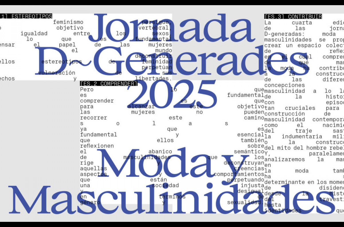 La cuarta edición de la jornada D-generadas: moda y masculinidades se propone crear un espacio colectivo de reflexión, en el cual comprender de qué manera la moda ha contribuido a la construcción de las diferentes concepciones de masculinidad a lo largo de la historia, con episodios tan capitales para la construcción de la masculinidad contemporánea como el del nacimiento del vestido sastre, la indumentaria militar o la construcción del mito del hombre rebelde. Y, paralelamente, analizaremos la manera con la cual la moda también ha estado determinando en los momentos de disidencia, desde la historia del transvestismo hasta las identidades queer. Es fundamental y esencial que "ellos también reflexionen sobre el abanico semántico de masculinidades que los rigen y deconstruyan aquellas creencias, aspectos y comportamientos que están perpetuando una sociedad injusta y desigual en clave de género y sexualidad", afirma el comunicado del museo. Entre los ponentes, Bob Pop, Ken Pollet o Sílvia Rosés.