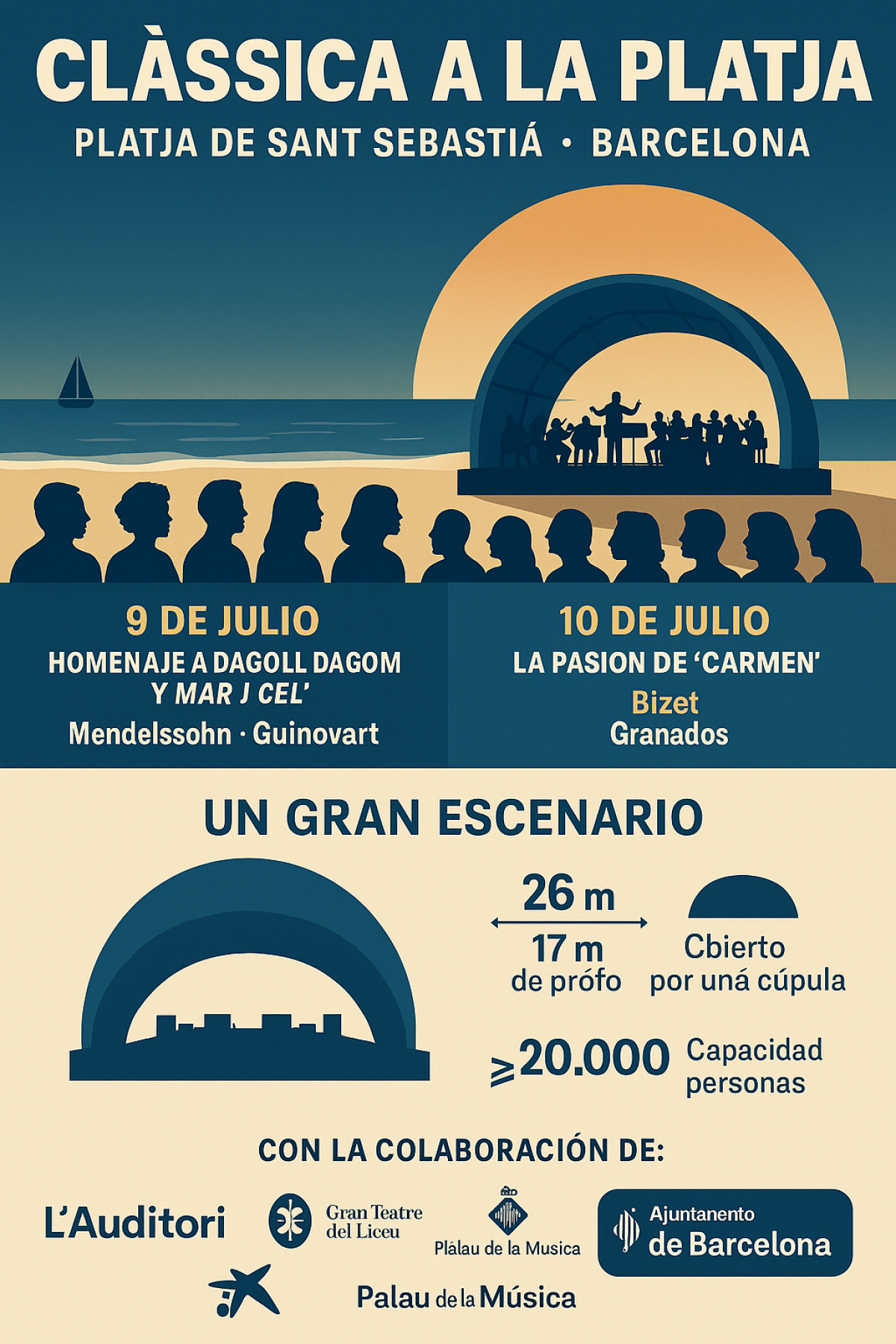 La playa de Sant Sebastià en Barcelona se prepara para acoger una nueva edición de "Clàssica a la platja", una cita ineludible con la música que, un año más, acercará grandes obras al público de forma gratuita. Los días 9 y 10 de julio, a las 21:00 horas, el emblemático litoral se transformará en un gran auditorio al aire libre para recibir fragmentos del aclamado musical "Mar i cel" y de la universal ópera 'Carmen'. Esta ambiciosa iniciativa es fruto de la colaboración de tres pilares culturales de la ciudad –L'Auditori, el Gran Teatre del Liceu y el Palau de la Música– junto al Ayuntamiento de Barcelona. Cuenta además con el apoyo fundamental de la Fundació "la Caixa" y el respaldo de Casa Seat-Cupra, Hutchison Ports Best, El Corte Inglés y Aigües de Barcelona.
