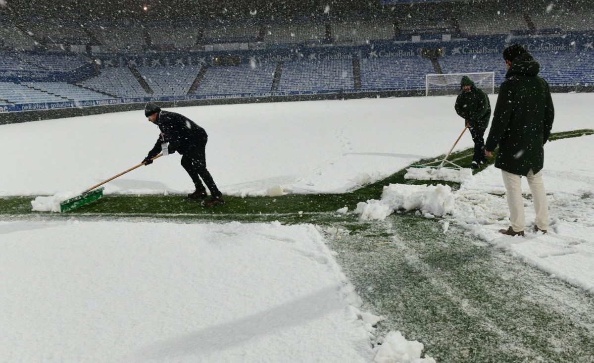 La nieve que ha cayó el pasado viernes 19 en Zaragoza cubrió el césped del estadio de La Romareda llevando a suspender el partido de fútbol que tenía previsto jugar el Real Zaragoza contra el Futbol Club Andorra.