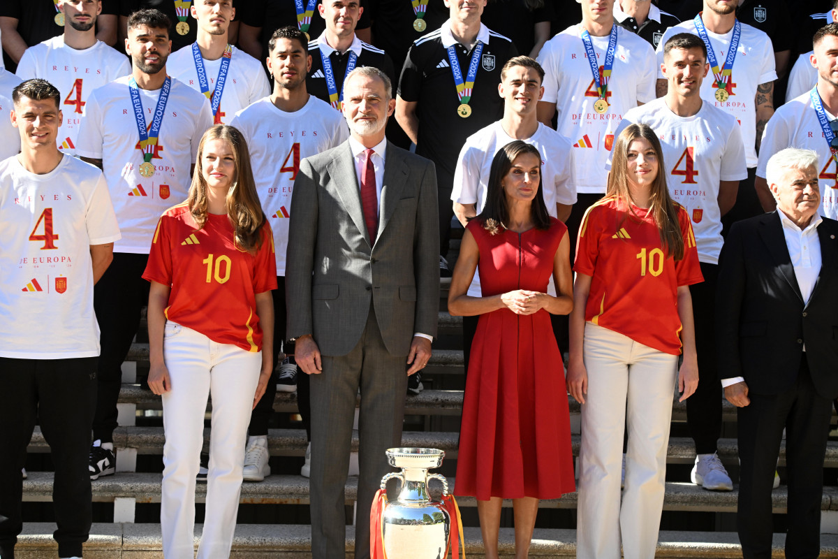 Felipe VI y Doña Letizia, acompañadas por sus dos hijas, Doña Leonor, Princesa de Asturias, y la Infanta Doña Sofía, ambas ataviadas con una camiseta de la 'Roja' con el número 10, y con la ministra de Educación, Formación Profesional y Deportes, Pilar Alegría, y el presidente del Consejo Superior de Deportes, José Manuel Rodríguez Uribes, recibieron a los internacionales a los que felicitaron por su victoria, aunque el monarca y su hija pequeña ya estuvieron presentes en la final e incluso Don Felipe fue el encargado de entregarles la copa de campeones.