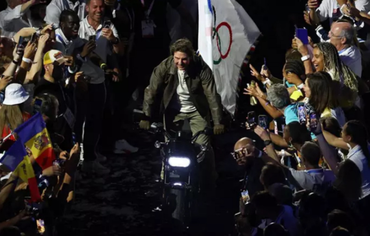A partir de ahí, arrancó la parte más cinematográfica. El popular actor estadounidense Tom Cruise bajó con un cable desde lo más alto del estadio hasta el escenario, agarró la bandera de los aros olímpicos y salió con ella subido en moto. Todo ello para luego saltar desde un avión a ritmo de los Red Hot Chili Peppers y su canción By the way.