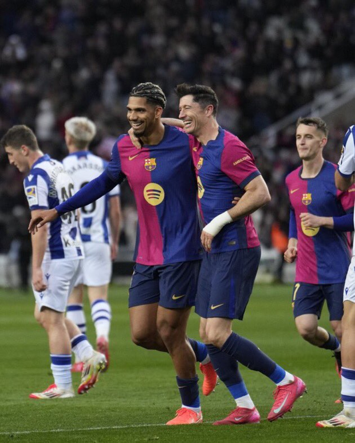 Los goles del Barcelona fueron anotados por Gerard Martín, Dani Olmo, Ronald Araújo y Robert Lewandowski. Gerard Martín abrió el marcador tras una jugada de Lamine Yamal. El segundo gol llegó con un disparo de Dani Olmo que se desvió en Marc Casadó. En la segunda mitad, Araújo y Lewandowski ampliaron la ventaja, sellando la goleada Con este triunfo, el equipo dirigido por Hansi Flick supera al Atlético de Madrid y al Real Madrid en la clasificación, aprovechando el empate de este último contra el Betis. La Real Sociedad, por su parte, no pudo reaccionar debido a la inferioridad numérica y la solidez del Barça, pero continuará luchando por los puestos europeos en las próximas jornadas.