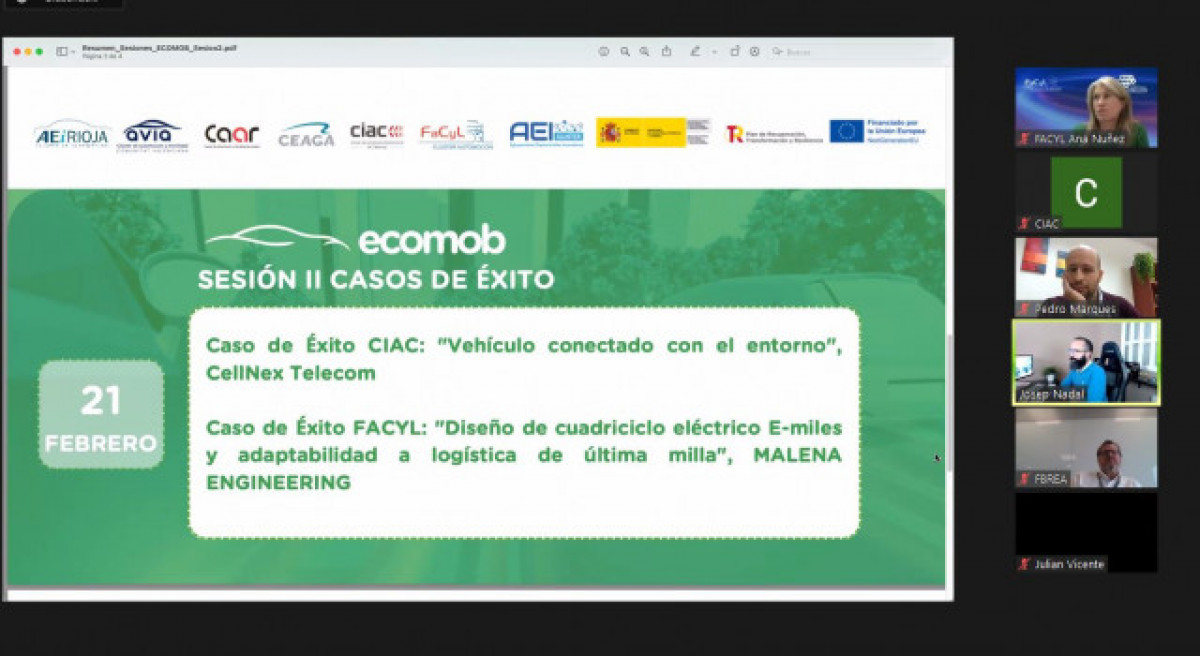 Segunda sesión del proyecto ECOMOB en las que los clusters de automoción de España (Aragón, Castilla y León, Cataluña, Galicia y La Rioja) comparten casos de éxito de sus empresas asociadas. En la reunión del martes, el CIAC y FACYL han sido los encargados de invitar a dos compañías que han compartido el desarrollo de sus iniciativas.