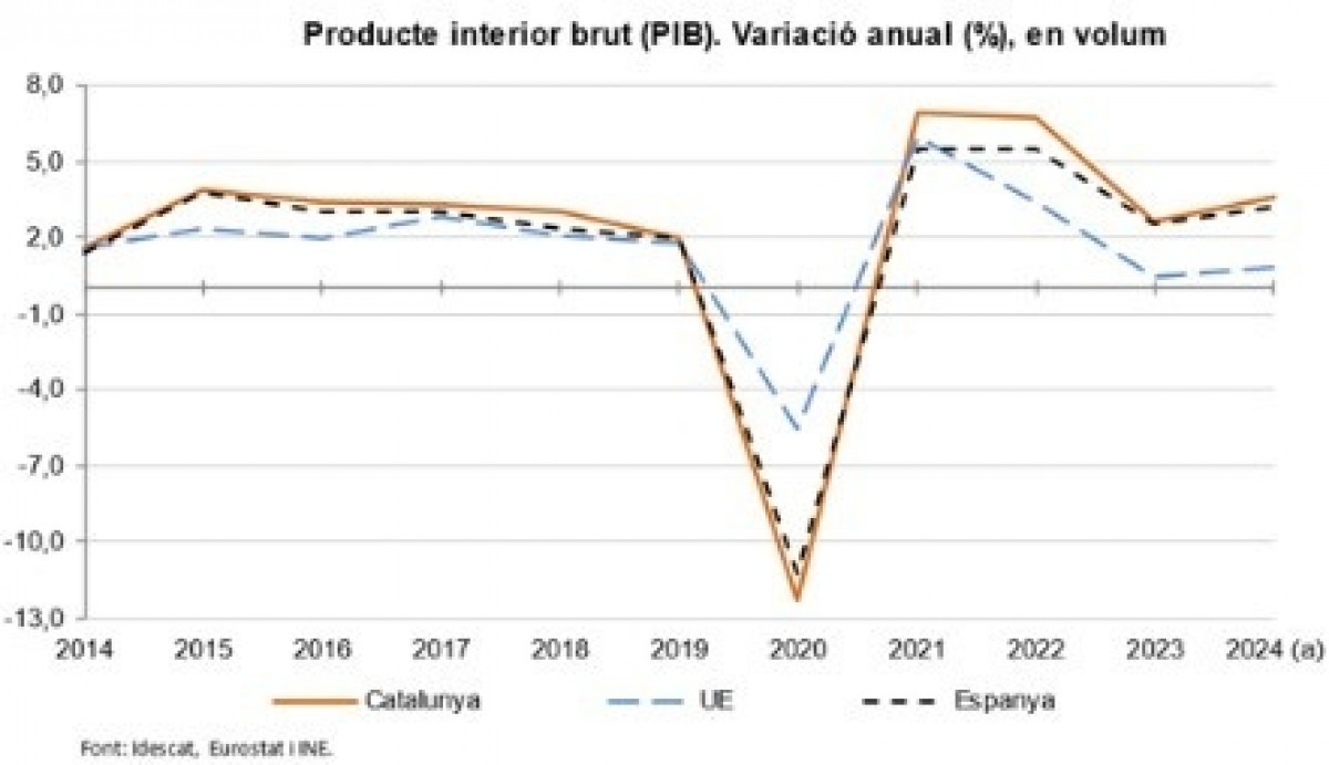 El PIB catalán creció un 3,6% anual durante 2024, por encima del avance de la economía española, que fue del 3,2%, según la estimación del Institut d'Estadistica de Catalunya (Idescat).