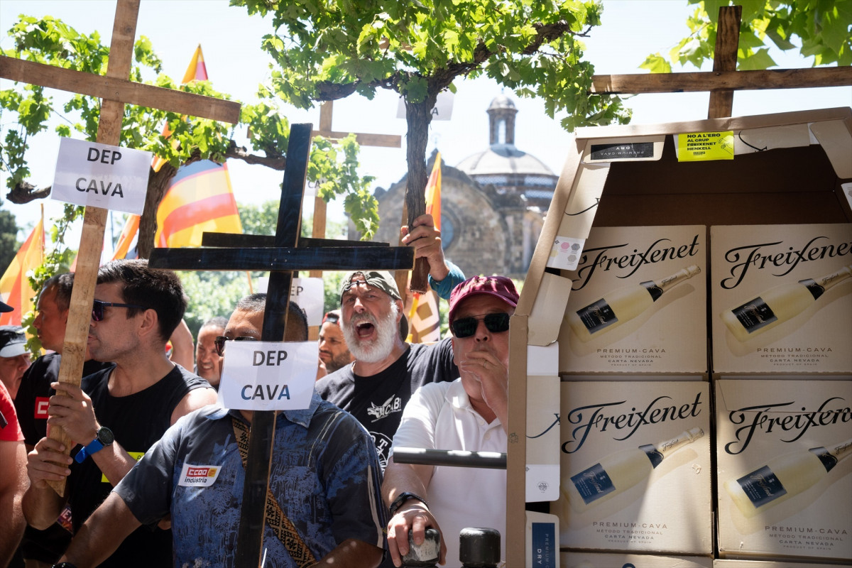 Los concentrados mostraban ramas de vid, un ataúd lleno de cajas de cava y cruces con el texto "DEP Cava", así como varias pancartas contra el ERE.