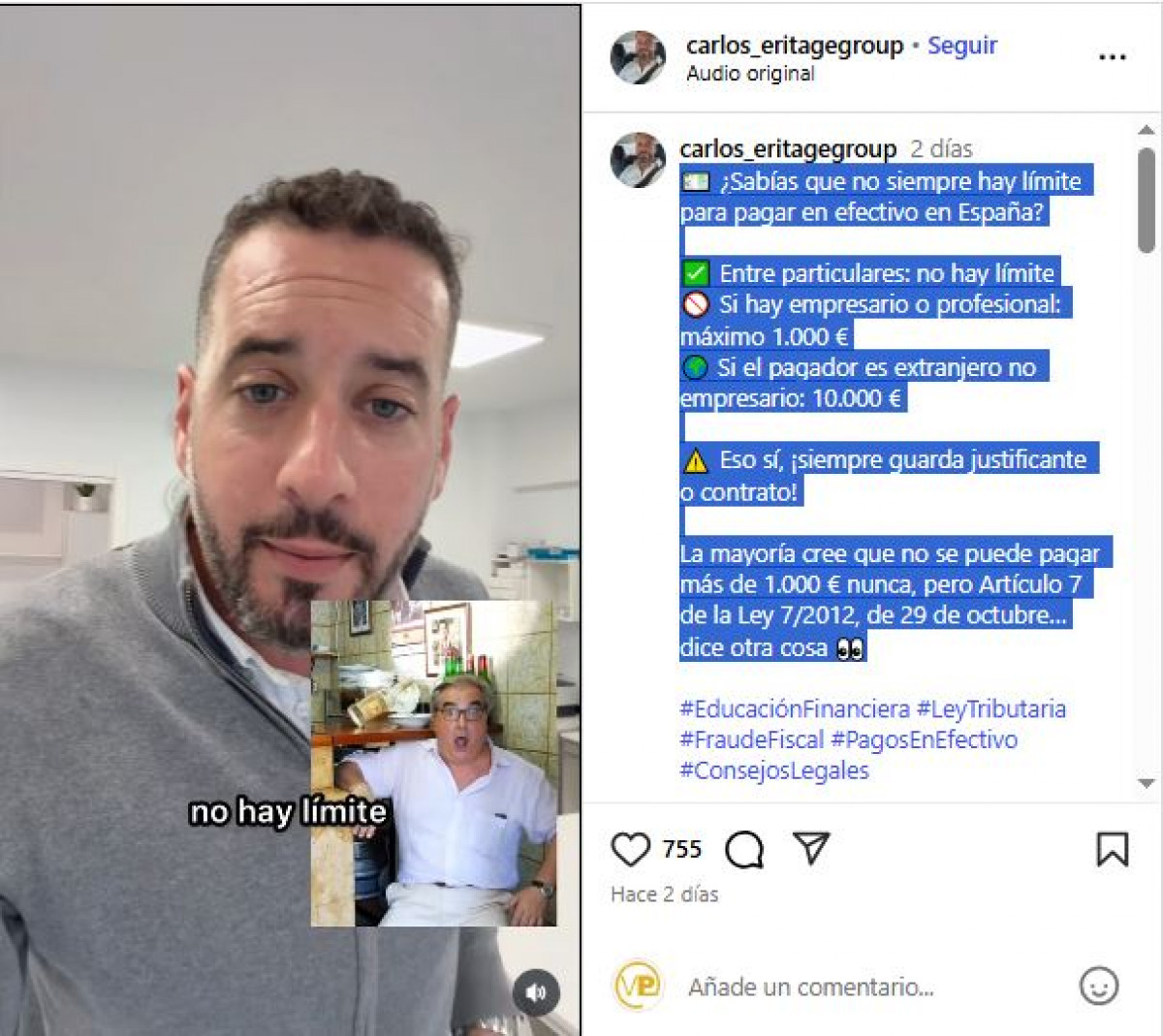 La publicación de Instagram de @carlos_eritagegroup aclara que entre particulares no hay límite para pagar en efectivo, mientras que con profesionales el máximo legal es de 1.000 €.