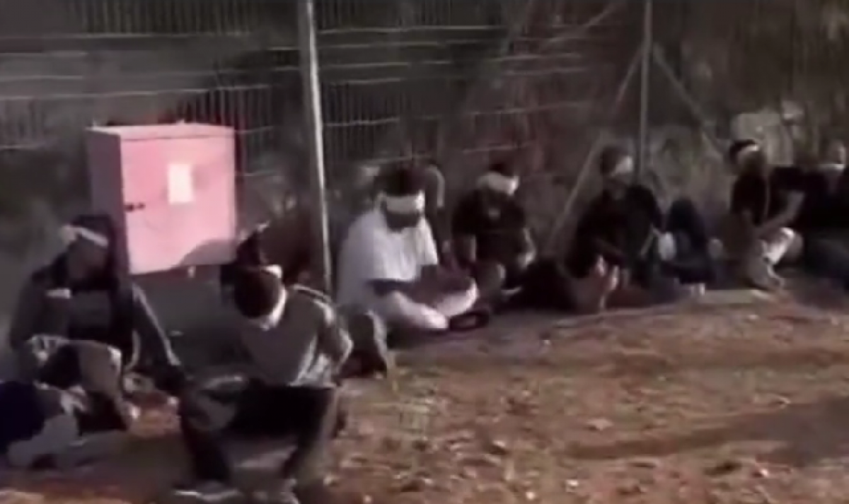 Los supuestos prisioneros son vistos con los ojos vendados y atados mientras están sentados en el suelo y escuchan los estruendosos acordes de “Mamtera Im Matara”, que se traduce como “Sprinkler With A Target”, informó el medio de comunicación israelí Walla .