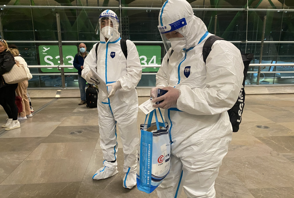 "Hoy he hecho un largo vuelo con estos señores del mono. De Doha a Madrid. Durante horas han soportado risitas, miradas y fotos de curiosos. “Somos chinos y nuestra empresa nos obliga a ir así. Por los virus que hay en Europa”, me han dicho. Y me han dado pena, la verdad.".