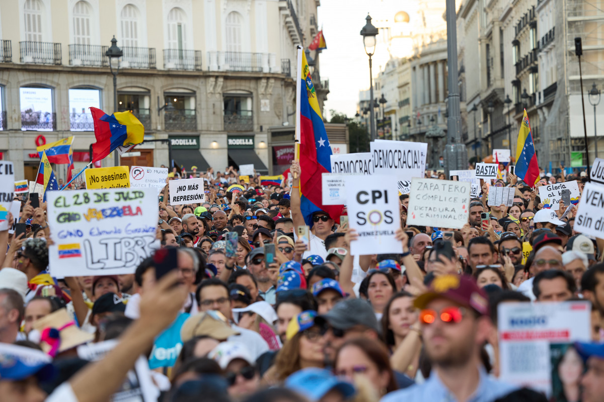 Miles de personas se han manifestado este sábado en la Puerta del Sol en Madrid en contra del "fraude electoral" en Venezuela y para reclamar la victoria del candidato de la oposición Edmundo González Urrutia en los comicios presidenciales celebrados en el país sudamericano el pasado 28 de julio. La protesta se ha extendido por todo el mundo, ya que se habían convocado en 350 ciudades. La de la capital de España, eso sí, ha sido la más multitudinaria.