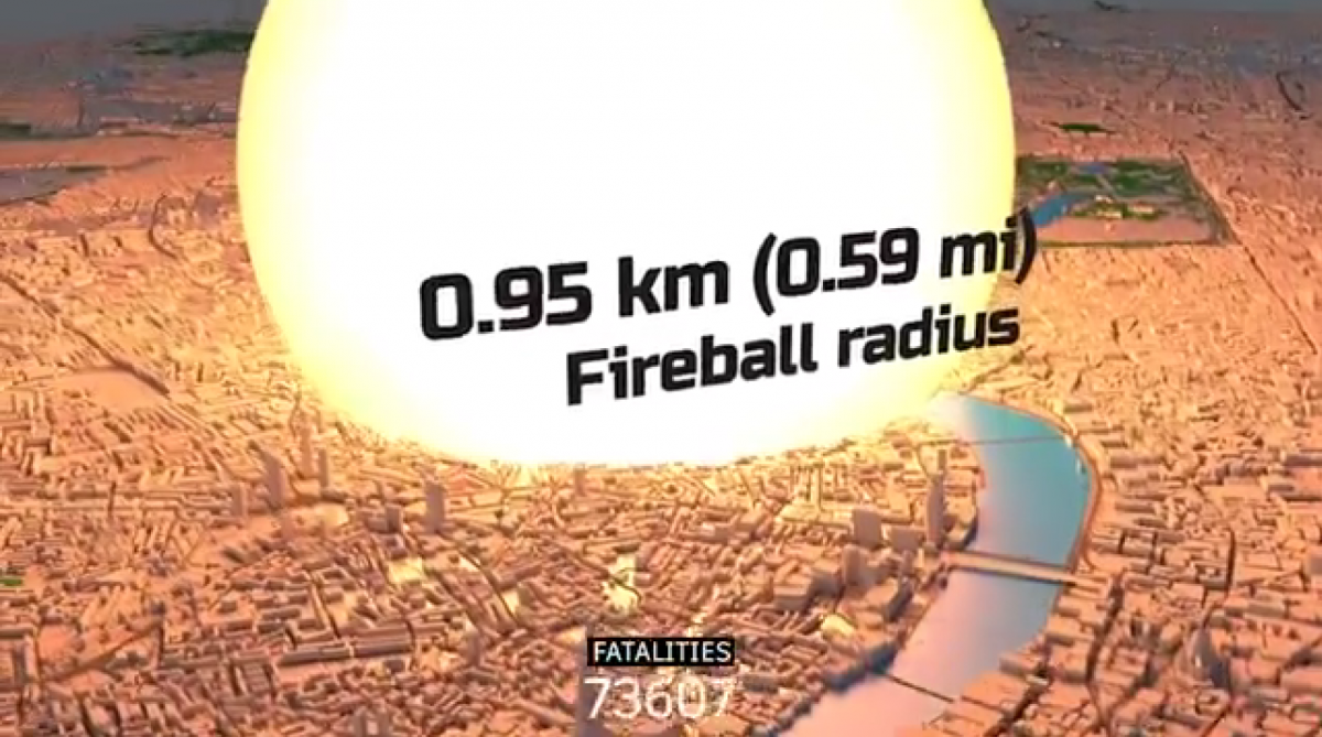 La simulación muestra lo que sucedería si una ojiva con 750 kilotones detonase, expandiendo una bola de fuego tan caliente como el Sol con un radio de 950 metros.