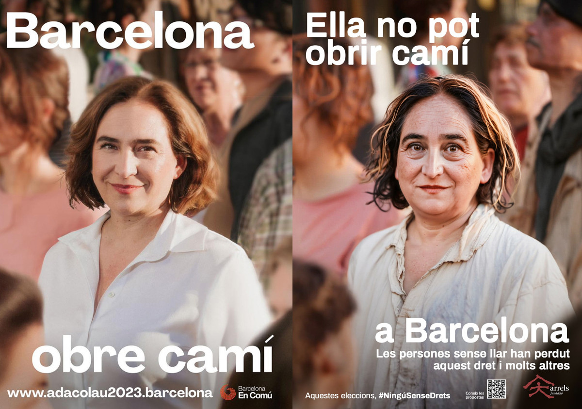En concreto, han adaptado los carteles de campaña de Ernest Magarall, Ada Colau, Jaume Collboni y Xavier Trias, transformando las imágenes de los candidatos y candidatas y sus mensajes y lemas electorales, llevándolos a una situación de sinhogarismo.