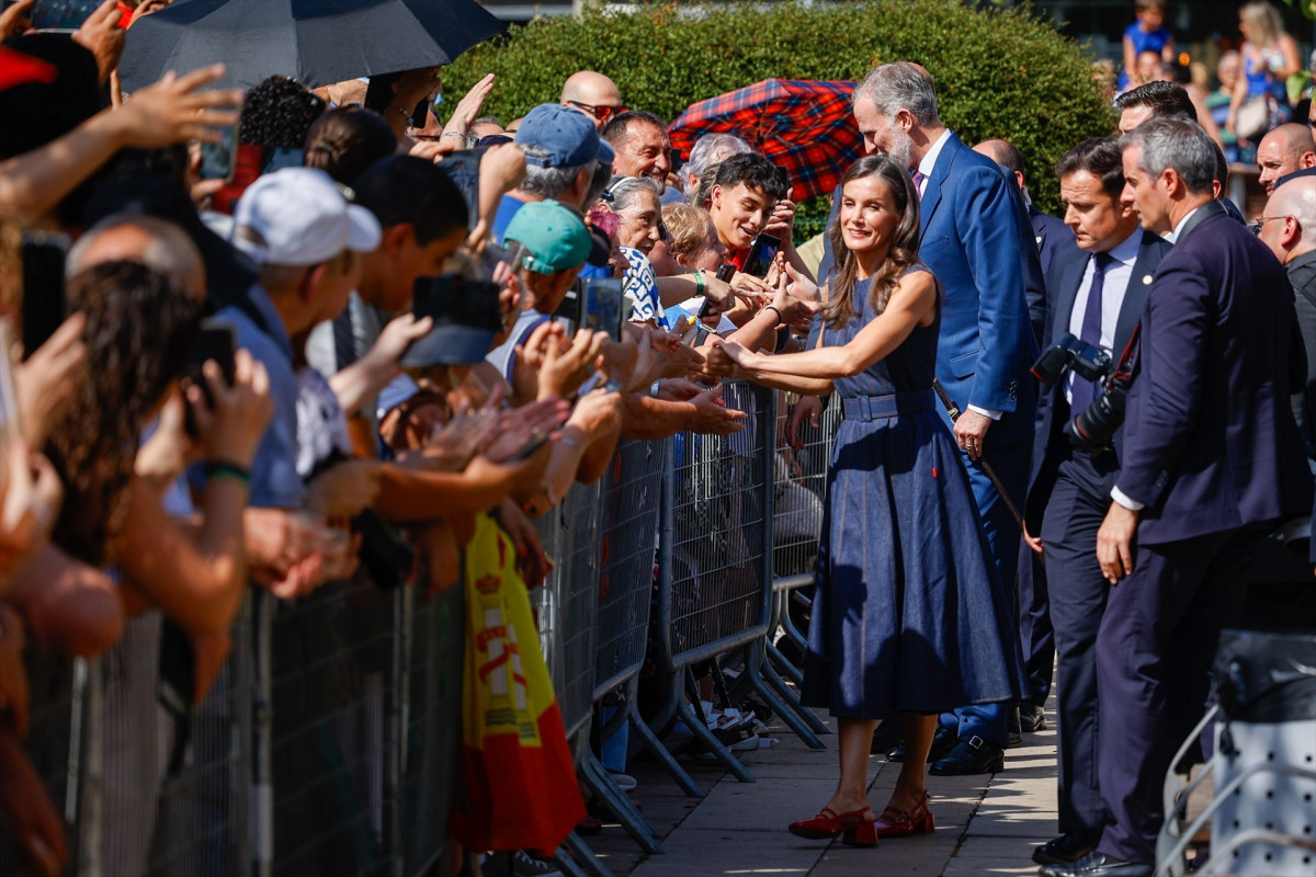 Los Reyes han saludado y estrechado la mano a algunos de los vecinos presentes, han charlado brevemente con ellos antes de entrar en el Ayuntamiento, y el Rey ha firmado banderas de España.