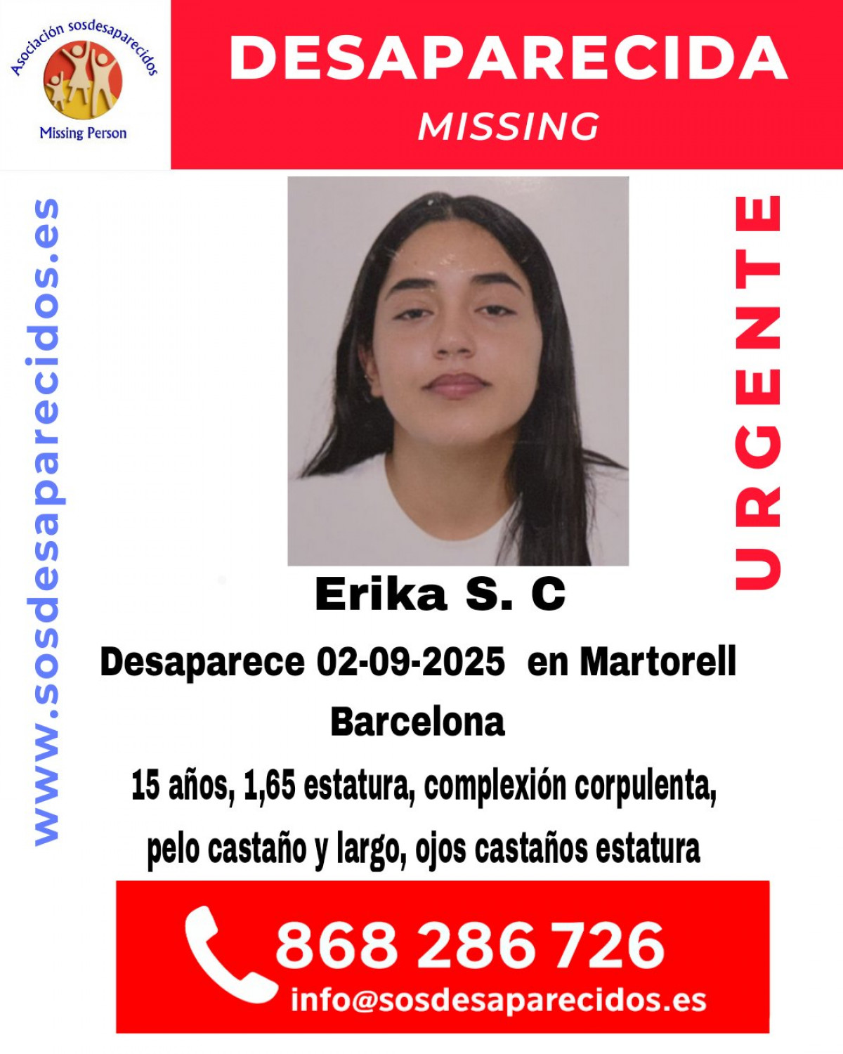 La asociación SOS Desaparecidos ha activado una alerta para solicitar la colaboración ciudadana en la búsqueda de Erika S. C., una de 15 años que desapareció el pasado 2 de septiembre de 2025 en Martorell. Según la descripción proporcionada por SOS Desaparecidos, Erika S. C. mide 1,65, tiene el pelo castaño y largo, los ojos marrones y es de complexión corpulenta.