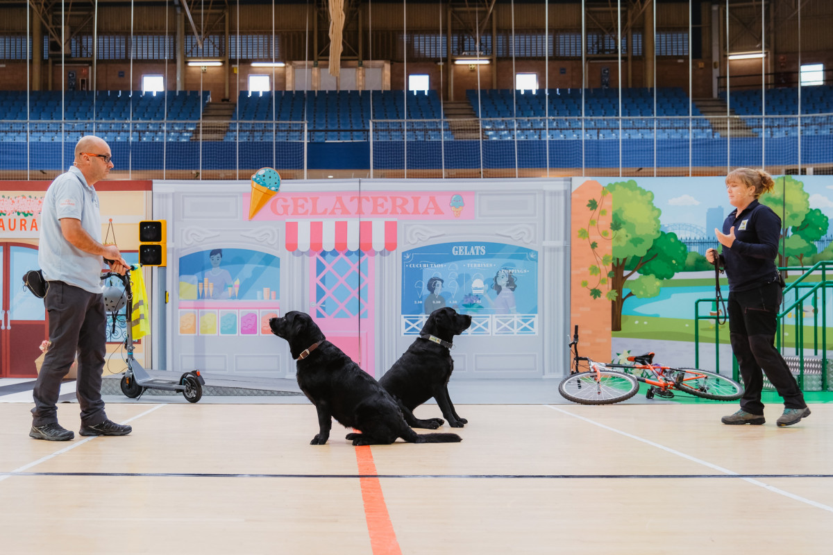 Durante la exhibición se mostró cómo los perros pueden salvar obstáculos, subir y bajar escaleras, cruzar pasos de peatones, buscar puertas y permanecer al lado de la persona ciega en espacios públicos como cafeterías o medios de transporte. Los usuarios de perro guía Eliseo Figuera y Laia Plana compartieron su experiencia diaria con HUDSON-I y UDAN, respectivamente.