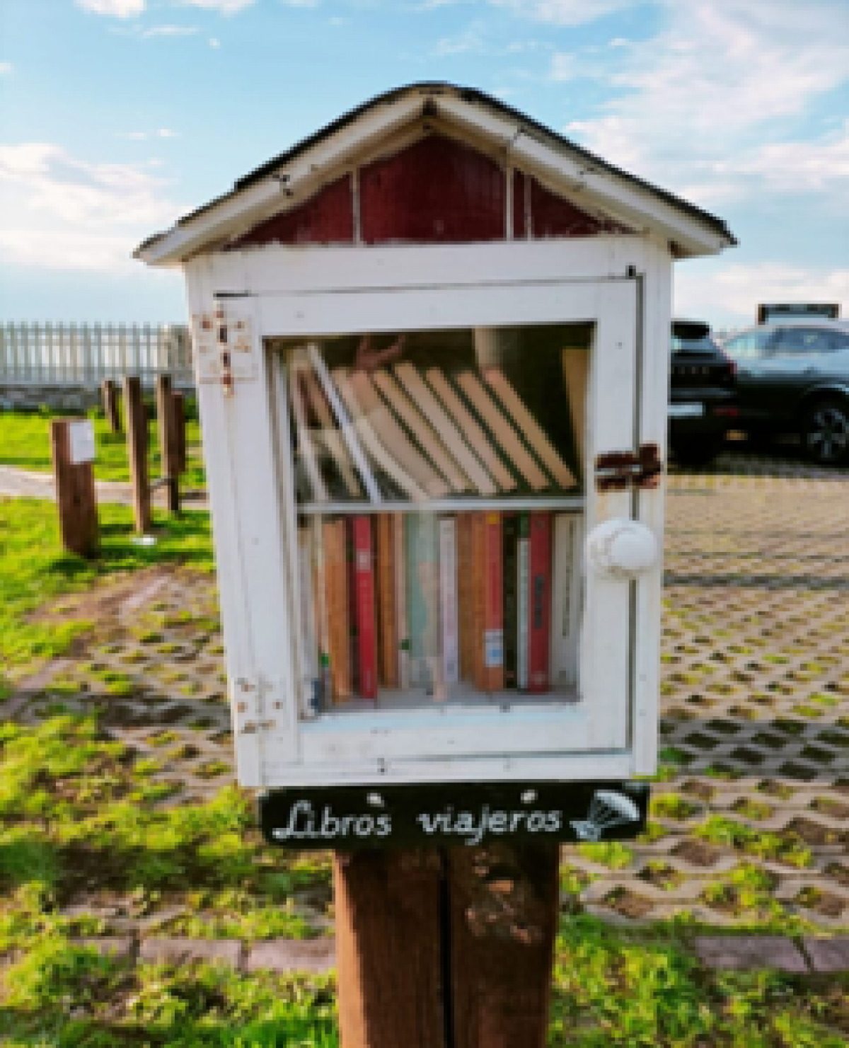 Esta iniciativa no es algo original. En Camprodón (Gerona), una cabina telefónica (cf. foto, “ci-dessus”) ha sido transformada en una pequeña biblioteca abierta. Este verano, en el cabo Busto (Asturias) y en plena naturaleza, encontré un pequeño “relicario” de madera acristalado (cf. foto, “ci-dessus”), con una treintena de reliquias, es decir de “libros viajeros”. Además, el “Bar Gonçalves” de Almagarinos (Bierzo Alto, León) es un “bar-biblioteca”, que permite saciar la sed del cuerpo y del alma de los parroquianos. Por otra parte, en la provincia de León, paradigma de la España vaciada y vacía, está en funcionamiento una red de seis “bibliobuses”, que recorren los pueblos de la provincia, cargados también de “libros viajeros”.