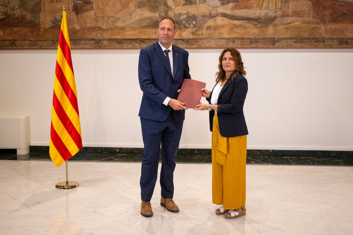 Vilagrà le ha entregado la carpeta de la Conselleria creada por el Govern del presidente Salvador Illa en la sala Torres Garcia del Palau de la Generalitat, donde se han saludado y han posado juntos para la fotografía ante los medios.