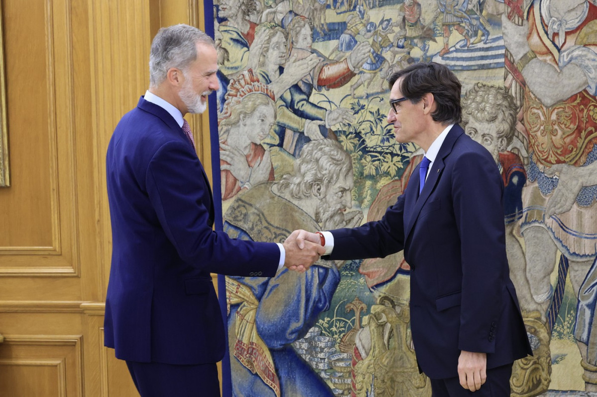 El monarca ha dado la bienvenida a Illa en el Salón de Audiencias, donde se han estrechado la mano ante los medios gráficos antes de pasar al despacho de Don Felipe para mantener la reunión.