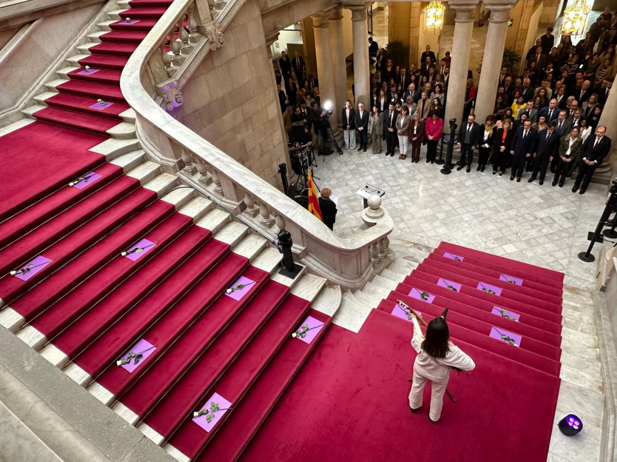 Tras la lectura de la declaración, el presidente de la Generalitat, Salvador Illa, el presidente del Parlament, Josep Rull, el resto de miembros del Govern y los diputados de los firmantes del texto se han dirigido hacia la escalera de honor del hemiciclo, donde han guardado un minuto de silencio en recuerdo de las víctimas de feminicidio de este año.
