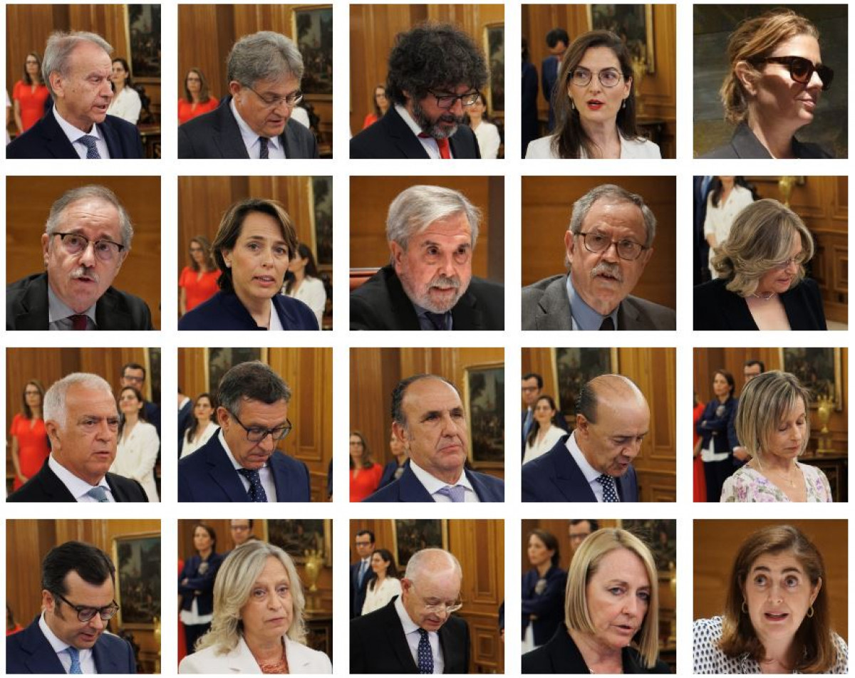 Los 20 nuevos vocales del Consejo General del Poder Judicial (CGPJ) han jurado o prometido su cargo esta mañana ante el Rey Felipe VI en el Palacio de La Zarzuela. En el acto, que ha tenido lugar en el Salón de Audiencias, estaban presentes el presidente del Gobierno, Pedro Sánchez, el ministro de Justicia, Félix Bolaños, la presidenta del Congreso, Francina Armengol, y los presidentes del CGPJ y del Tribunal Constitucional, Vicente Guilarte y Cándido Conde-Pumpido.