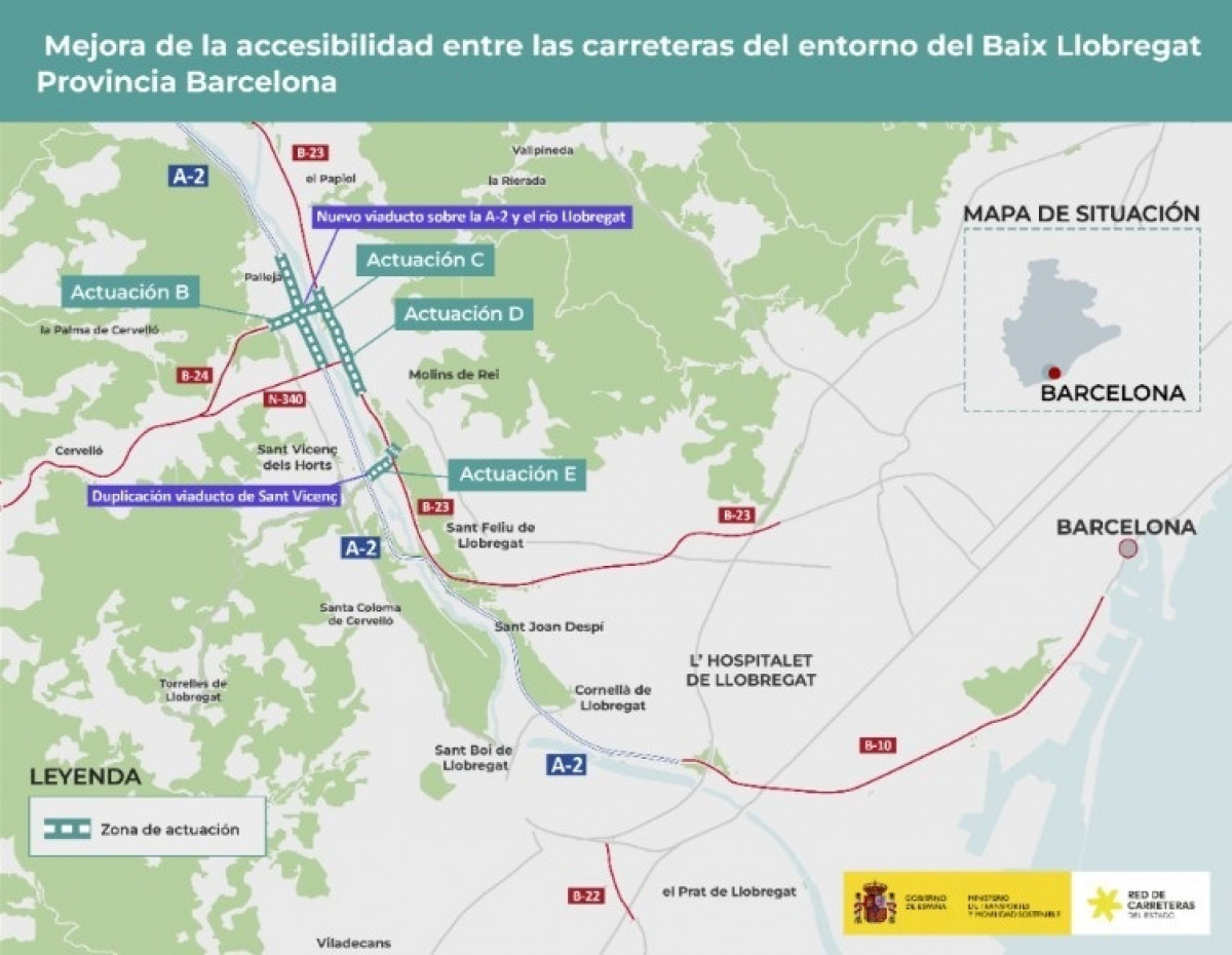 Específicamente y entre otras actuaciones, se remodelará el enlace de la B-24 con la A-2, prolongando la B-24 hasta enlazar con la B-23 mediante un nuevo viaducto de 487,5 metros, y también se ejecutará un nuevo enlace en el margen izquierdo del Llobregat entre la prolongación de la B-24 con la B-23 en Molins de Rei.