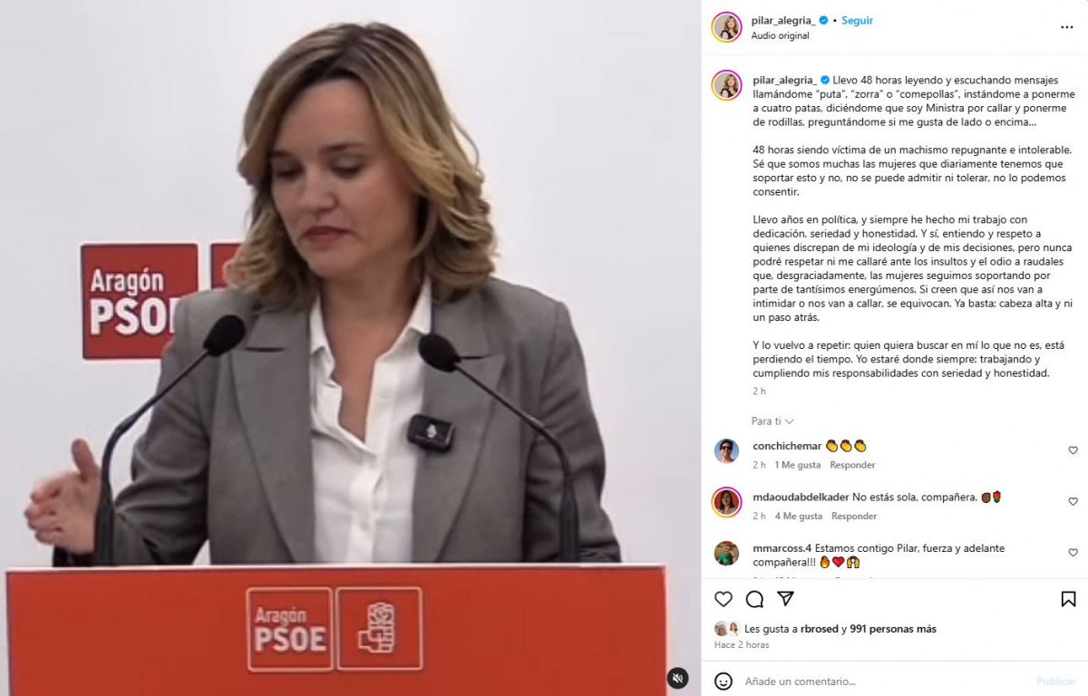 En un mensaje publicado en su cuenta de Instagram, Alegría ha expuesto con crudeza los ataques sexuales y violentos que ha sufrido en redes: “Me han llamado ‘puta’, ‘zorra’, ‘comepollas’, me instan a ponerme a cuatro patas, dicen que soy ministra por callar y ponerme de rodillas, me preguntan si me gusta de lado o encima”. La ministra asegura estar harta de que las mujeres públicas sigan siendo blanco de agresiones verbales que nada tienen que ver con la crítica política: “No se puede admitir ni tolerar. No lo podemos consentir”.