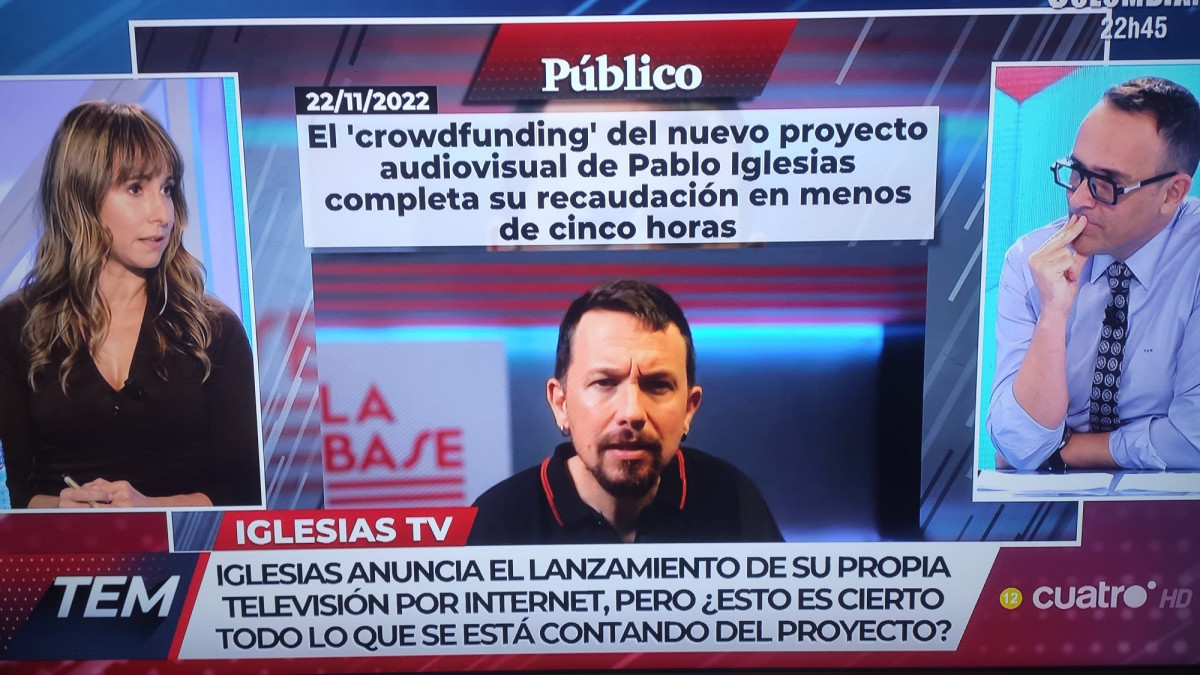 "Entendimos las dos partes que hasta aquí llegaba la colaboración y que él montaba su propio proyecto, se iba de Público", ha añadido, matizando que por el momento, tanto La Base, el programa presentado por Pablo Iglesias, como La Frontera de Juan Carlos Monedero, "seguirán emitiendo en Público hasta que asienten su nuevo proyecto y comiencen a emitir canal red a través de Youtube".
