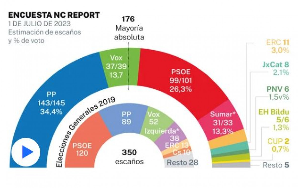 Mientras la encuesta de El País y ABC van por otro lado. Ambas también señalan pérdida de escaños para Vox de hasta trece escaños pero la de la ABC atribuye al partido de derechas un descalabro de entre 23 y 27 escaños. Mientras Feijóo lleva varios días quitandole hierro a los acuerdos en ayuntamientos y comunidades con Vox.