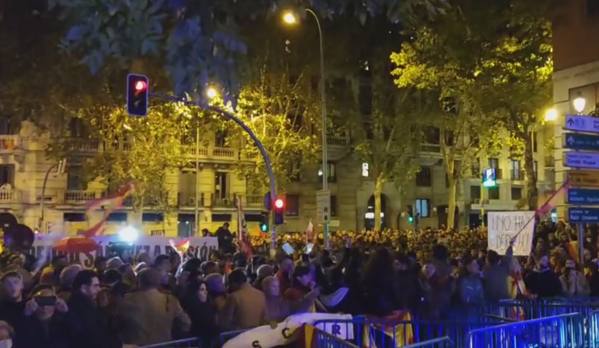 VÍDEO: Cánticos contra Sánchez y Puigdemont en Ferraz mientras los manifestantes empiezan a lanzar piedras