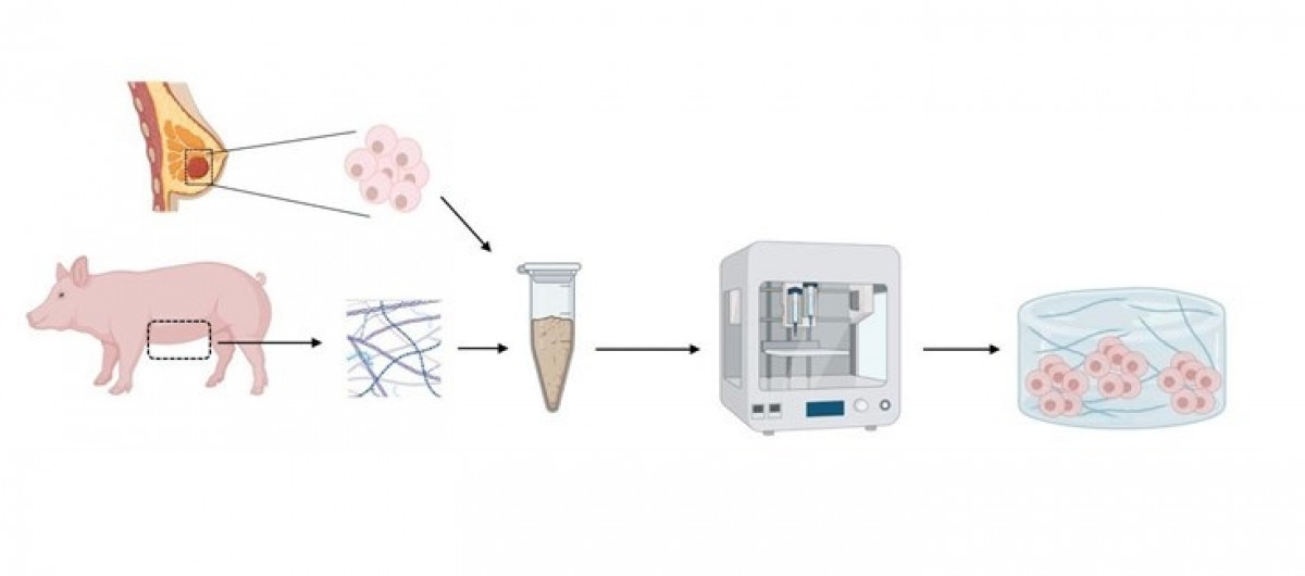 Con el objetivo de recrear esa compleja ECM, el equipo ha utilizado tejido de mama de cerdo hembra, aprovechándose de la gran similitud entre los genomas de cerdos y humanos, y de que es un tejido que se puede obtener de forma sencilla y en gran cantidad.