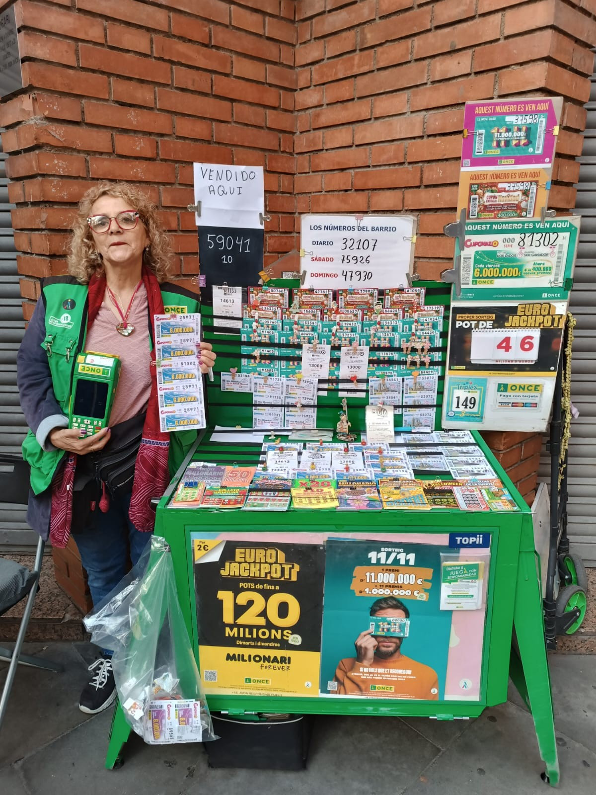Una vendedora de la ONCE reparte cinco cupones premiados con 35.000 euros cada uno desde su punto de venta en el carrer San Silvestre de Santa Coloma de Gramenet