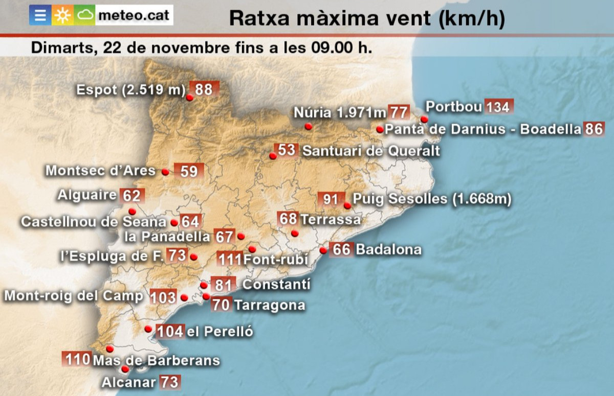 Protecció Civil de la Generalitat ha activado, este martes 22 de noviembre, el plan VENTCAT por las fuertes rachas de viento, especialmente en el litoral y el prelitoral central y sur de Catalunya.