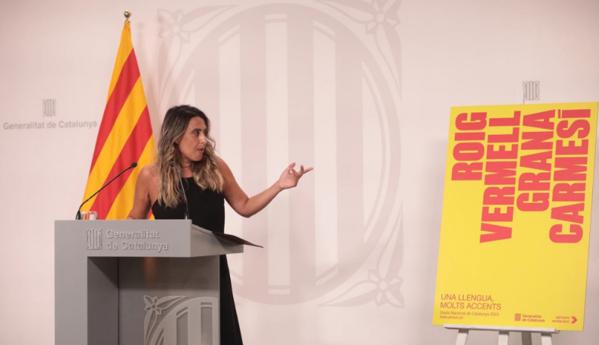 La portavoz del Govern, Patrícia Plaja, ha presentado el cartel institucional de la Generalitat de la Diada del 11 de septiembre, un cartel con el fondo amarillo y las palabras en rojo, y con sinónimos de ese color roig, vermell, grana y carmesí, emulando una senyera, y también ha presentado el lema: Una llengua, molts accents (Una lengua, muchos acentos).