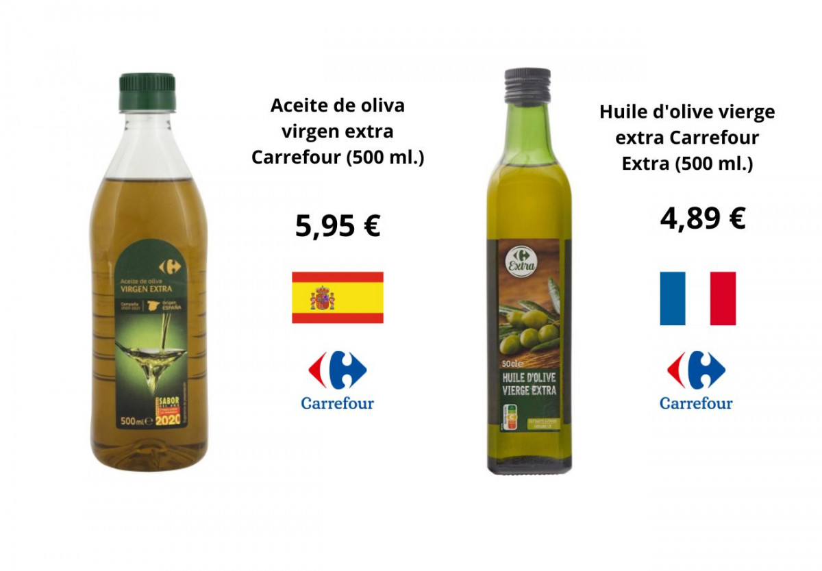 La asociación ha detectado también precios diferentes en función del país en el virgen extra ecológico de marca Carrefour. El formato de un litro se vende en España a 9,95 euros, mientras que en Francia está a 9,55 euros, un 4,1% menos.