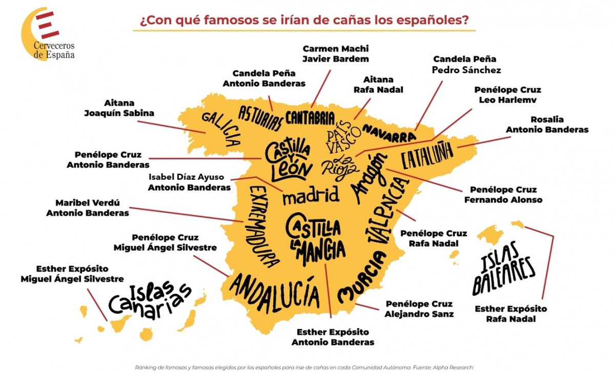 La cantante Rosalía y el actor Antonio Banderas son los favoritos de los catalanes para irse de cañas y tapas, según una encuesta de Cerveceros de España por el Día Internacional de la Cerveza.