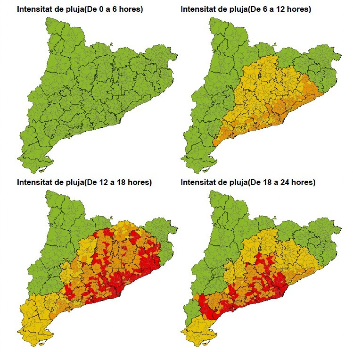 Según las previsiones del Servei Metereològic de Catalunya (SMC), se pueden superar los 40 litros en 30 minutos en el Litoral y Prelitoral Sur, Catalunya Central, Litoral y Prelitoral Central, Plana de Vic, Prepirineo Oriental y Litoral y Prelitoral Norte.