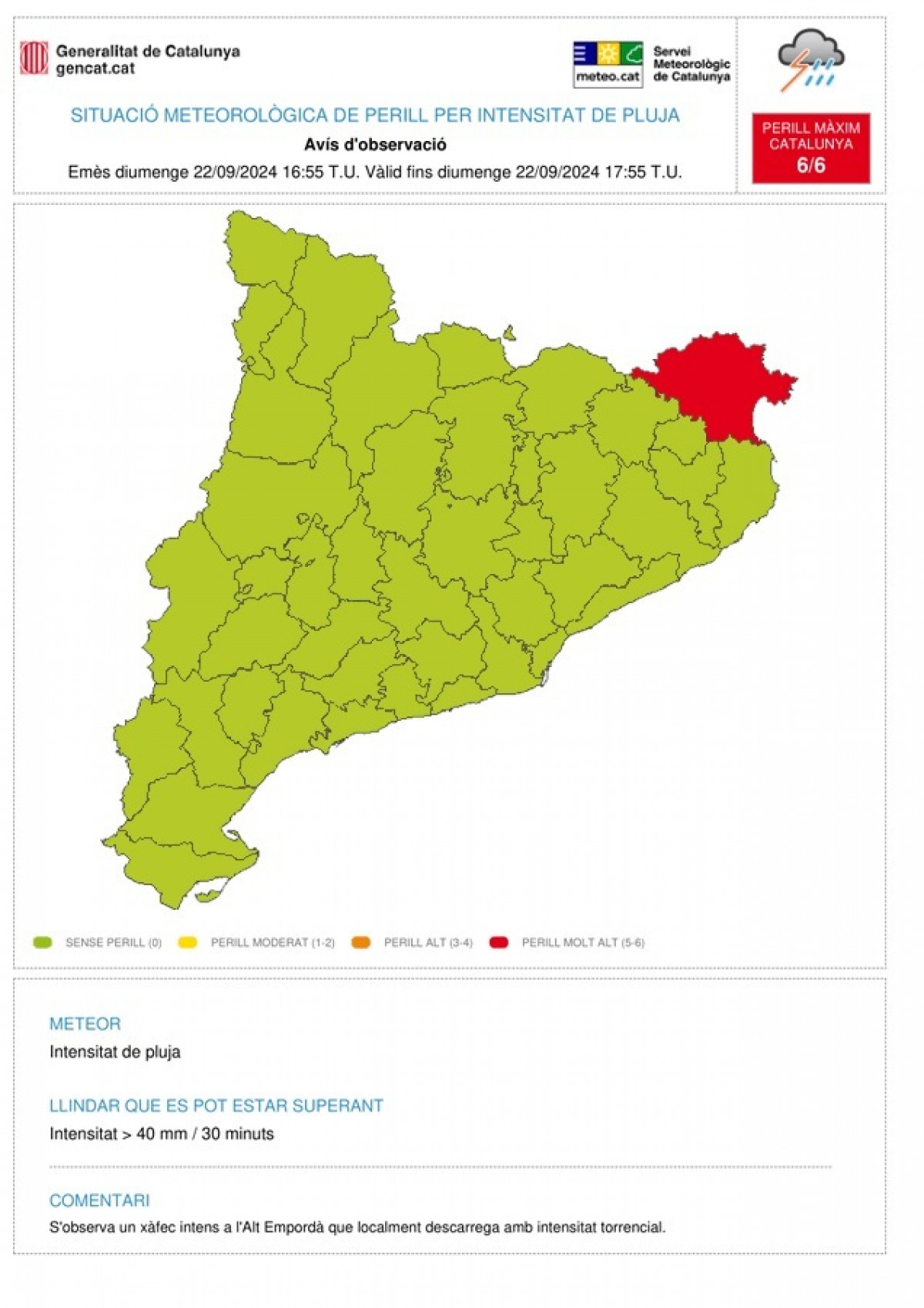 En Espolla se ha registrado una intensidad máxima de 41,2 mm en 30 minutos, informa el Meteocat en un mensaje de X recogido por Europa Press.