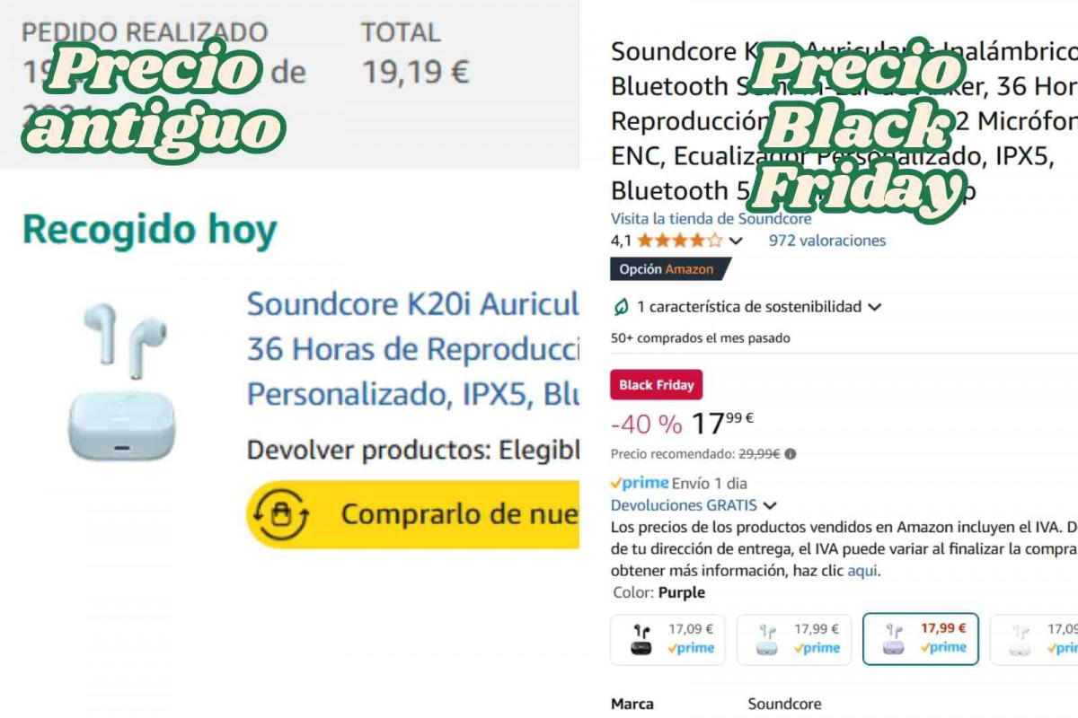 El 19 de noviembre, estos auriculares estaban disponibles por 19,19 euros. Durante el Black Friday, Amazon los anuncia por 17,99 euros, afirmando que antes costaban 29,99 euros, lo que equivaldría a un supuesto descuento del 40%. Sin embargo, comparando con el precio de hace solo dos días, la rebaja es mucho menor: