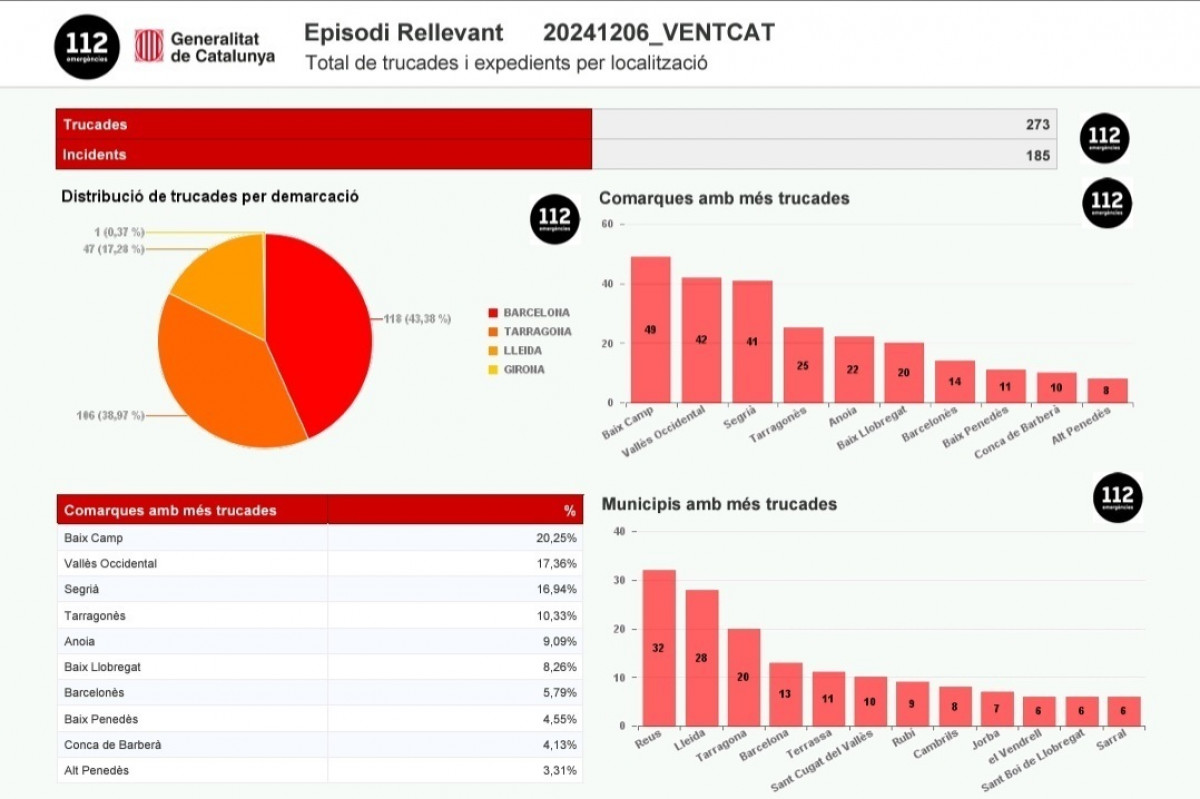 El teléfono de emergencias 112 ha recibido este sábado hasta las 16 horas un total de 273 llamadas por el episodio de fuertes vientos que sufre Catalunya, correspondientes a 185 incidentes, según ha informado el servicio en un mensaje en X recogido por Europa Press.