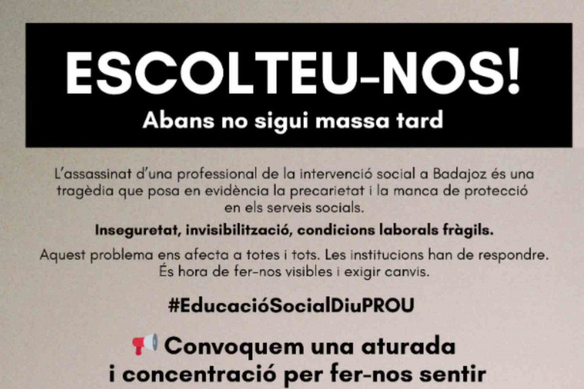 El brutal asesinato de una educadora social de 35 años en un piso tutelado en Badajoz, ha dejado consternado al sector de la educación social en toda España. La tragedia, ocurrida el pasado domingo, ha puesto en evidencia la creciente precariedad y la falta de protección a la que se enfrentan los profesionales que trabajan en los centros de acogida de menores. Ante este panorama, el Col·legi d’Educadores i Educadors Socials de Catalunya (CEESC) ha convocado para este miércoles, 12 de marzo, una jornada de protesta que incluirá una paralización de actividades por la mañana y una gran concentración a las 18:00 h en diversas ciudades de Cataluña.