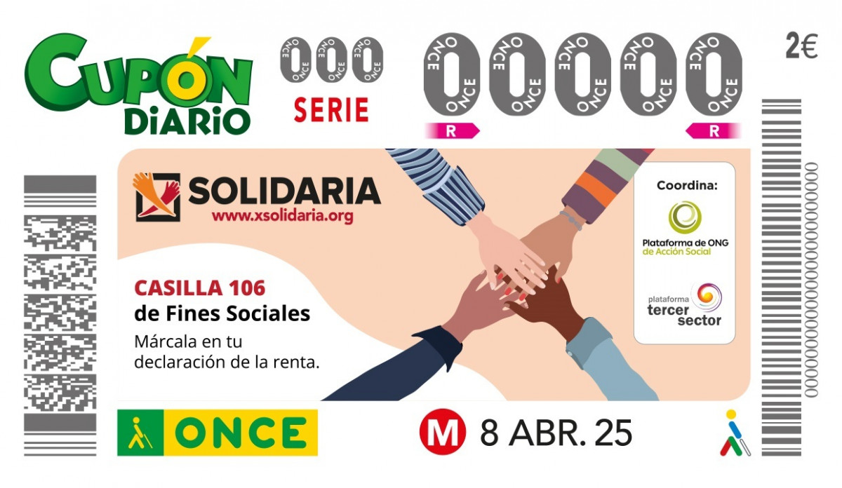 El cupón de la ONCE del próximo martes 8 de abril hace un llamamiento a marcar la Casilla 106 de Fines Sociales en la Declaración de la Renta, conocida como la 'X Solidaria', en un total de cinco millones de cupones que llevarán este mensaje por toda España con el objetivo de sensibilizar a la ciudadanía sobre la importancia de esta acción.