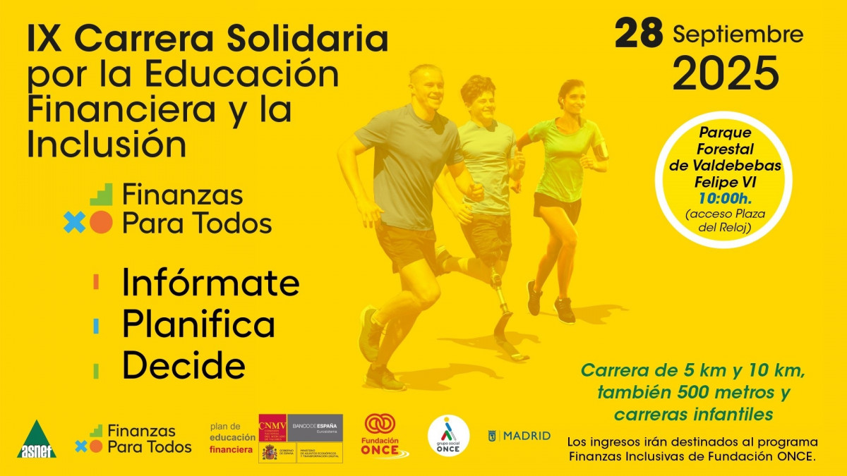 La Fundación ONCE y la Asociación Nacional de Establecimientos Financieros de Crédito (ASNEF) convocan la IX Carrera Solidaria por la Educación Financiera y la Inclusión, que se disputará en el Parque Forestal de Valdebebas, en Madrid, este domingo 28 de septiembre, a partir de las 10.00 horas, según han informado ambas entidades.