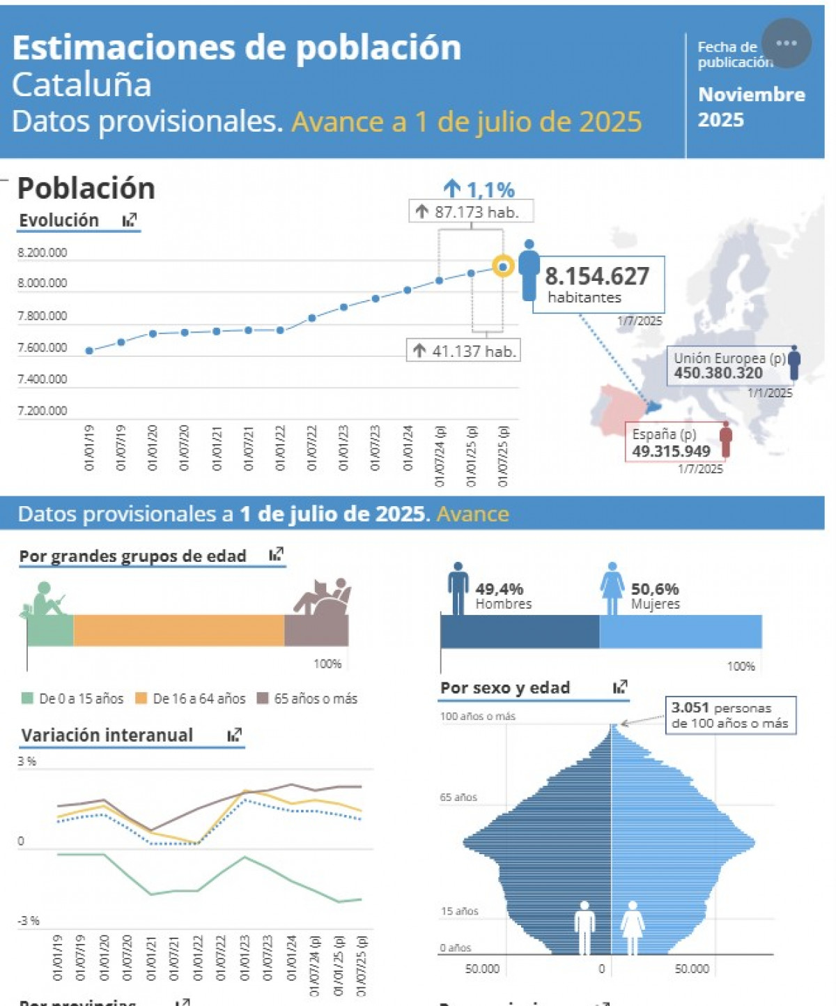 La población de Catalunya alcanzó los 8.154.627 habitantes al 1 de julio de 2025, marcando un crecimiento de 41.137 personas durante el primer semestre del año. Según el avance de las estimaciones de población del Institut d'Estadística de Catalunya (Idescat), el crecimiento interanual se sitúa en 87.173 habitantes, lo que representa un aumento del 1,1%.